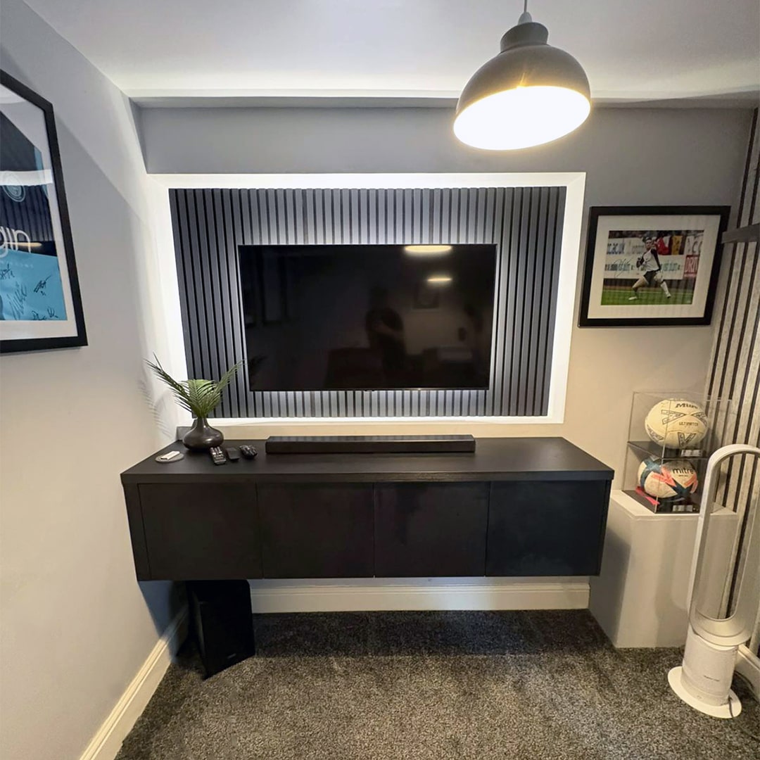 The boys’ bedroom presented its own set of challenges, including more awkward ceiling angles and the need to accommodate existing IT cables. However, DAY & KNIGHT’s experienced installers, Albert and Fin, tackled these obstacles with skill and precision, ensuring a seamless integration of the media wall unit into the room’s unique layout.